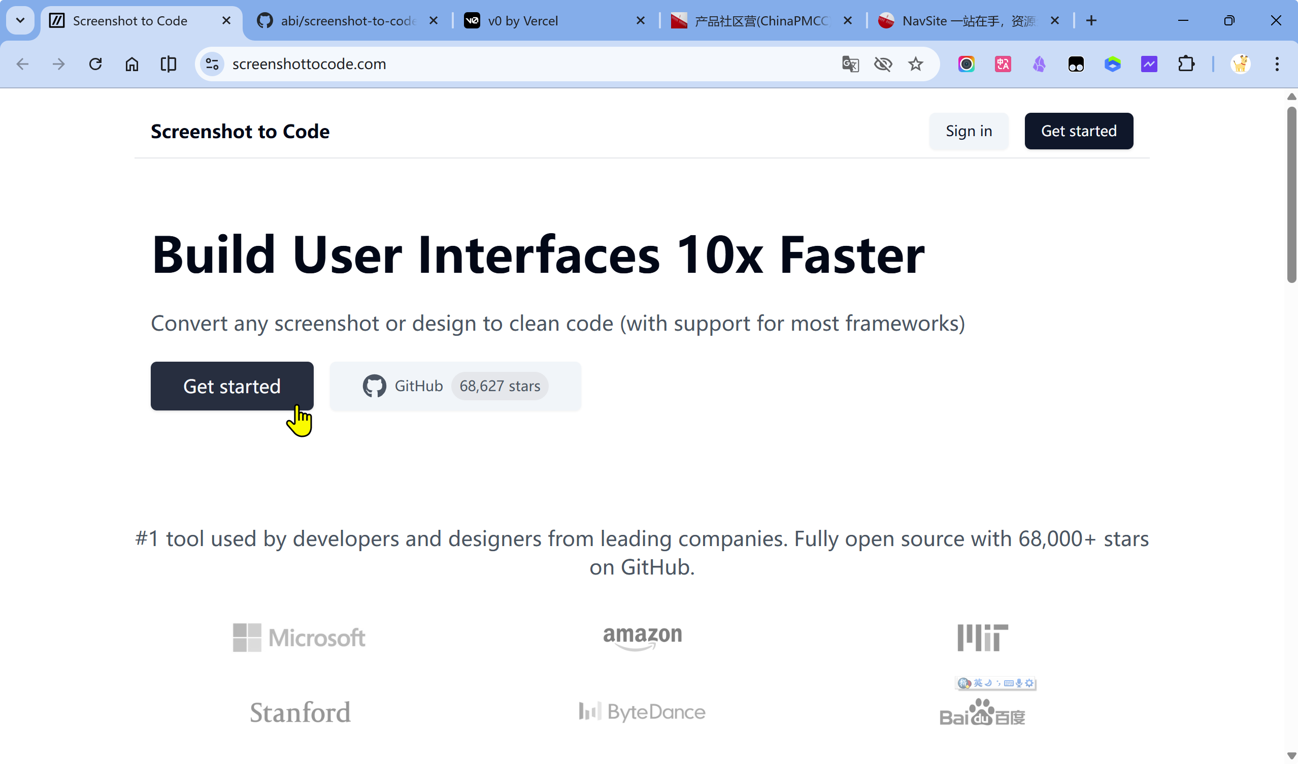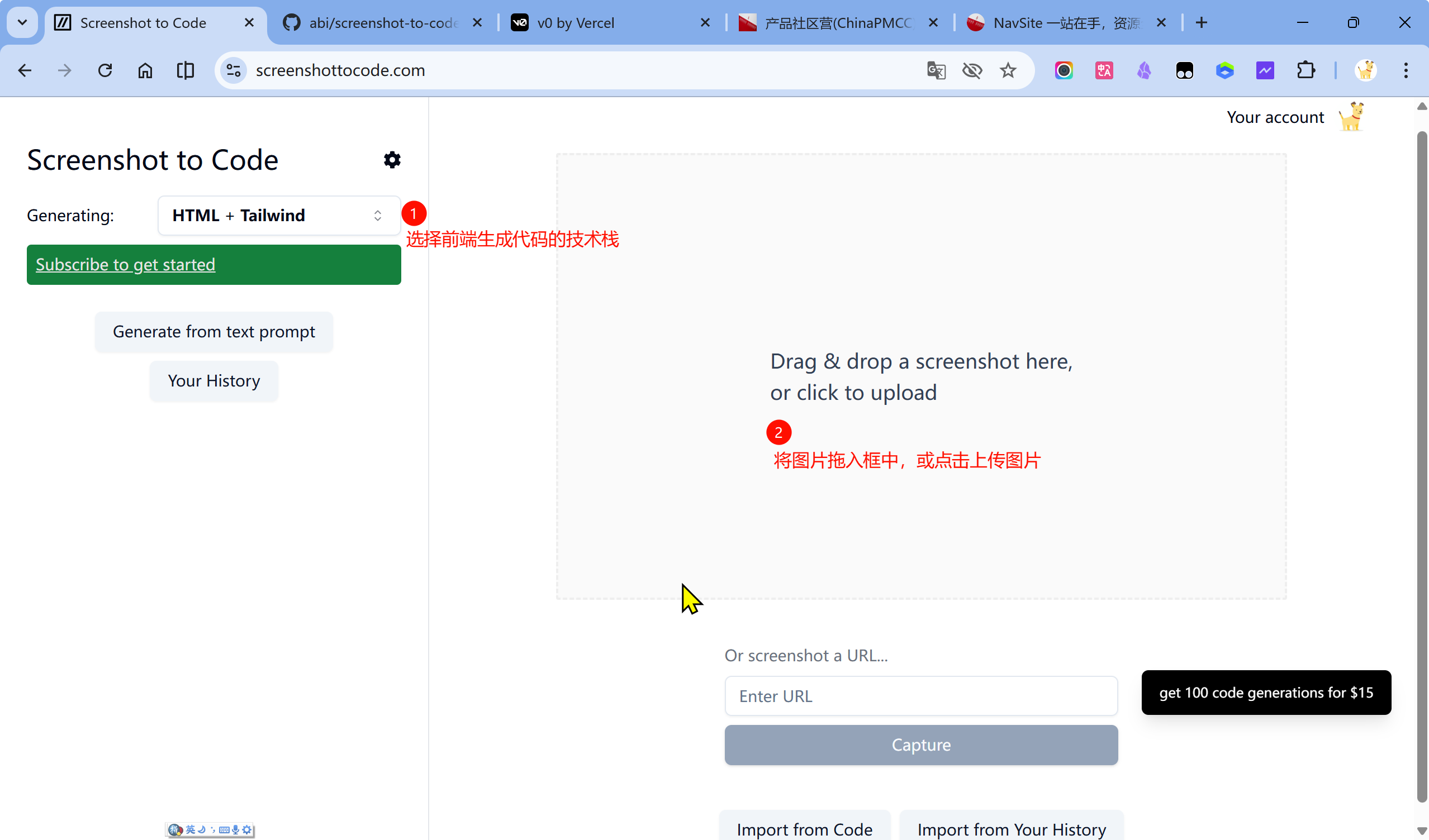 打开网站: 访问 Screenshot-to-code 官网。点击