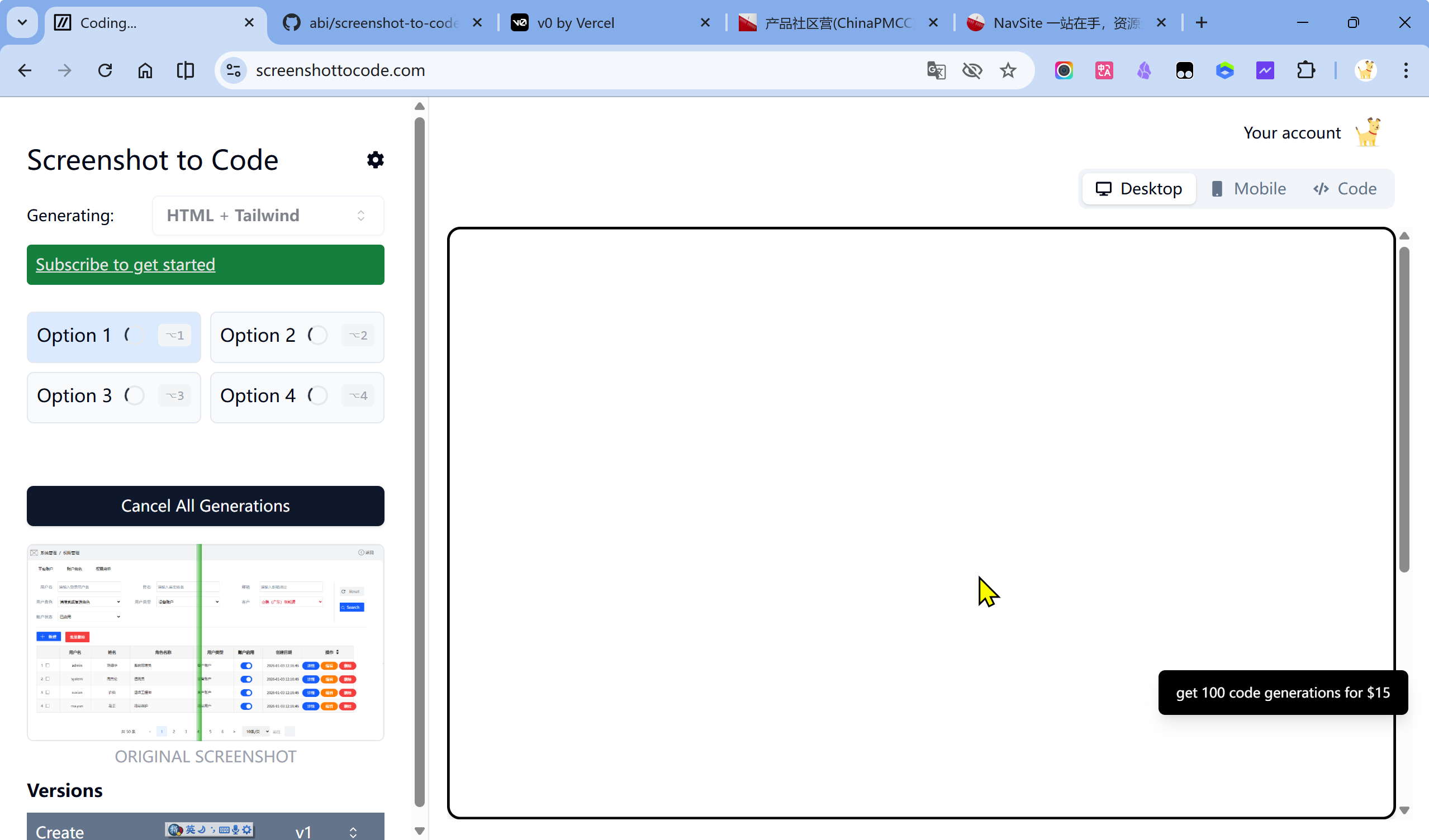 费用: 自己部署开源项目screenshot-to-code,然后使用AI模型API密钥;或者 直接付款使用 $15~40/ month