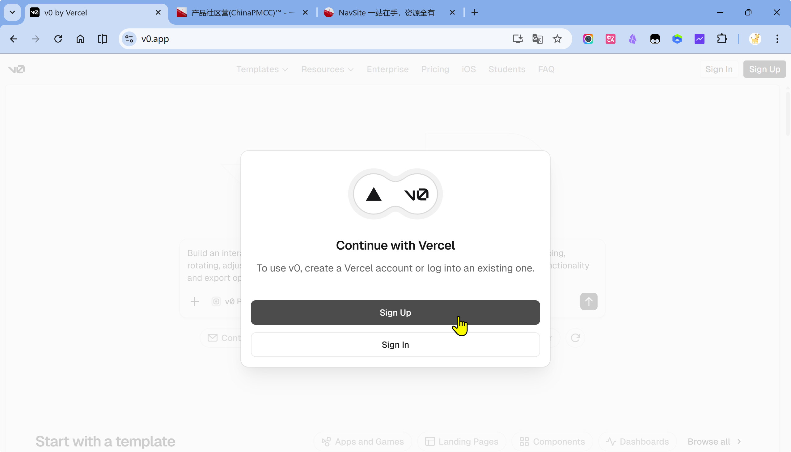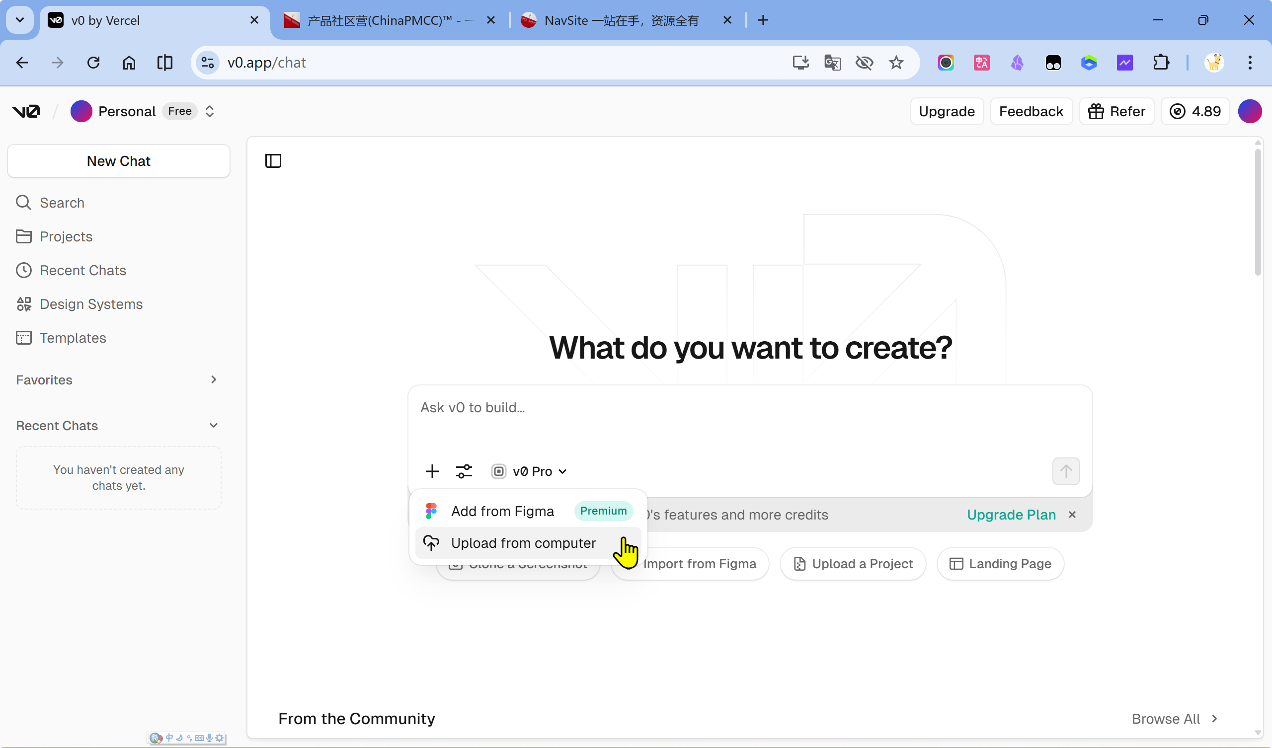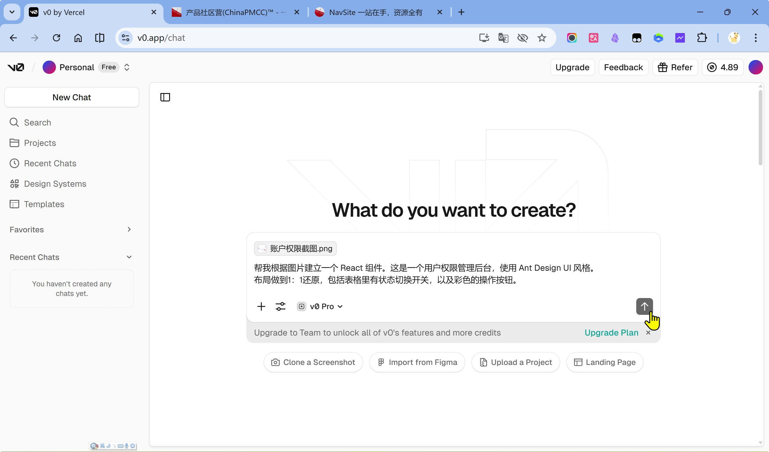 多版本选择: AI 会给出三个不同的设计版本供你选择(v0 Mini、v0 Pro、v0 Max)。