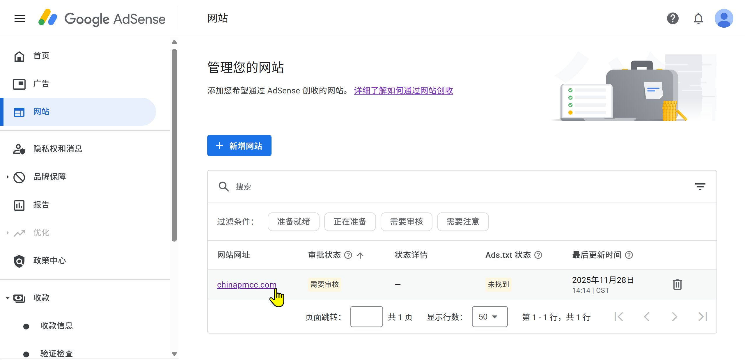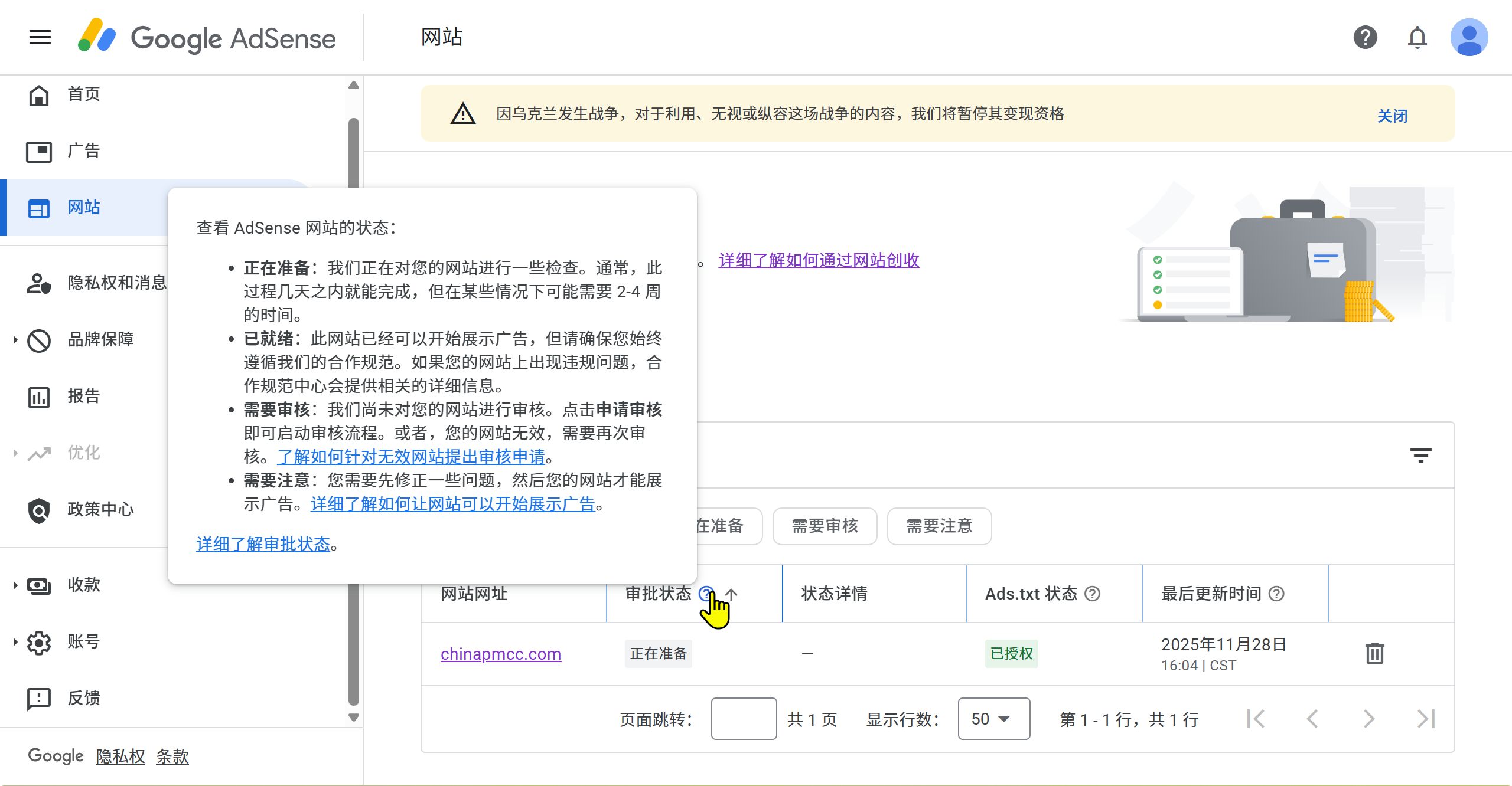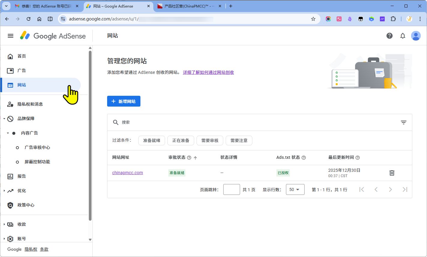 确认网站状态为“已就绪”: 登录 AdSense 后台,点击 “网站” 菜单。确保您的域名旁边显示的是绿色的 “已就绪” (Ready),而不是“正在准备中”。