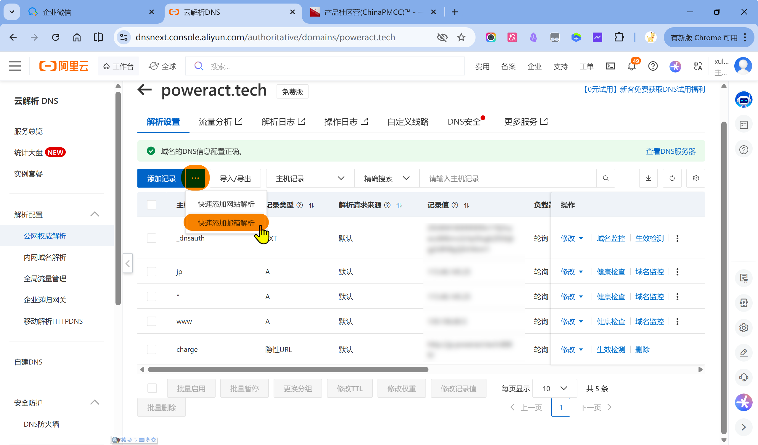 4. 根据域名注册源,添加域名解析,点击去登录,会自动跳转