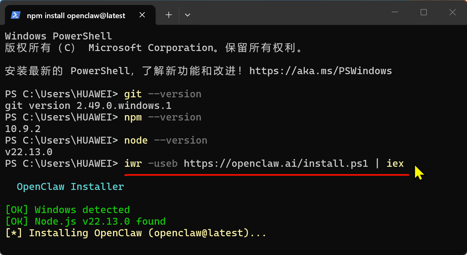 npm install -g openclaw@latest --registry https://registry.npmmirror.com |