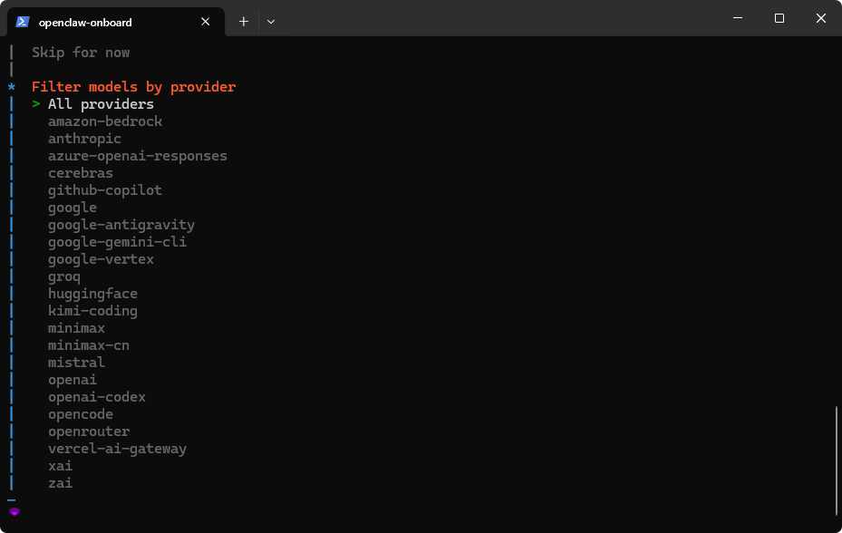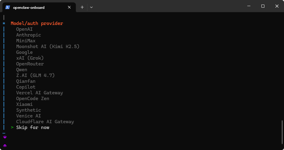 | Model/auth provider | 选择 Skip for now(配置模型) |
