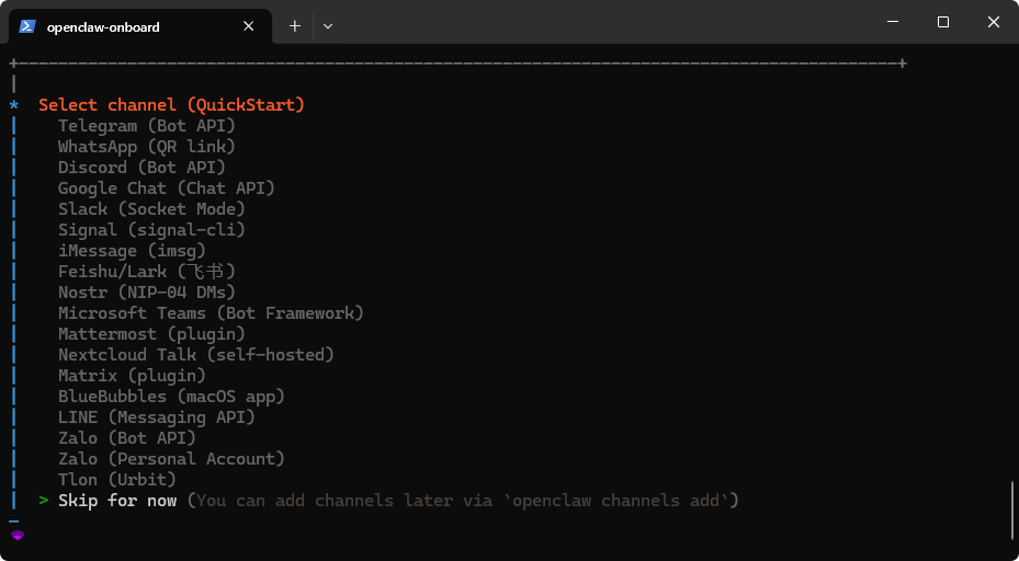 | Select channel (QuickStart) | 选择 Skip for now(配置渠道) |
