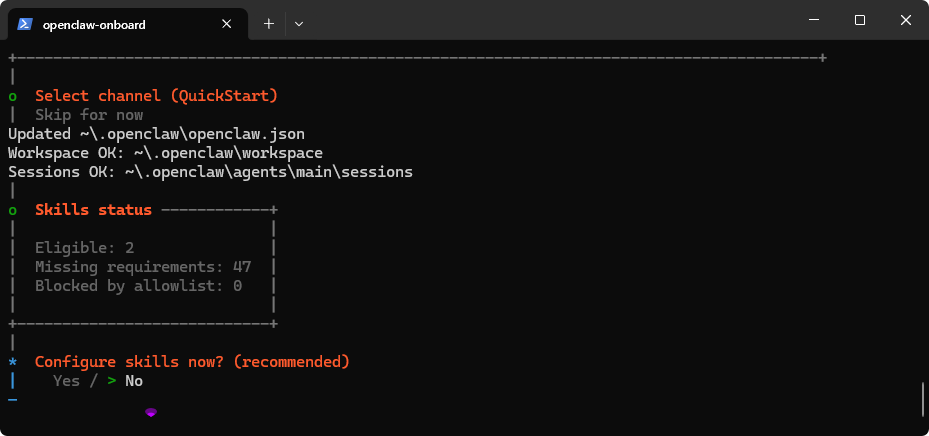 | Configure skills now? (recommended) | 选择 No |