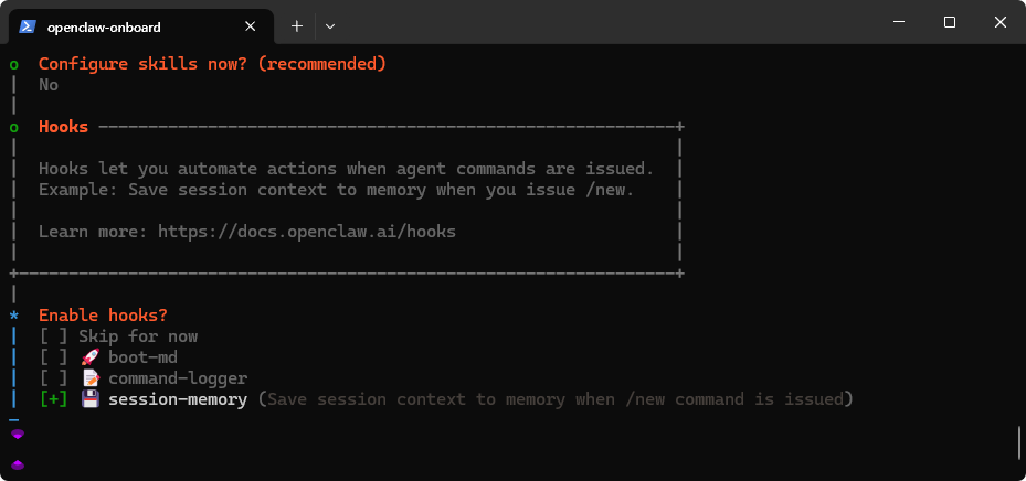 | Skip for now | 跳过,不启用任何 hook | ✅ 新手建议先跳过 |