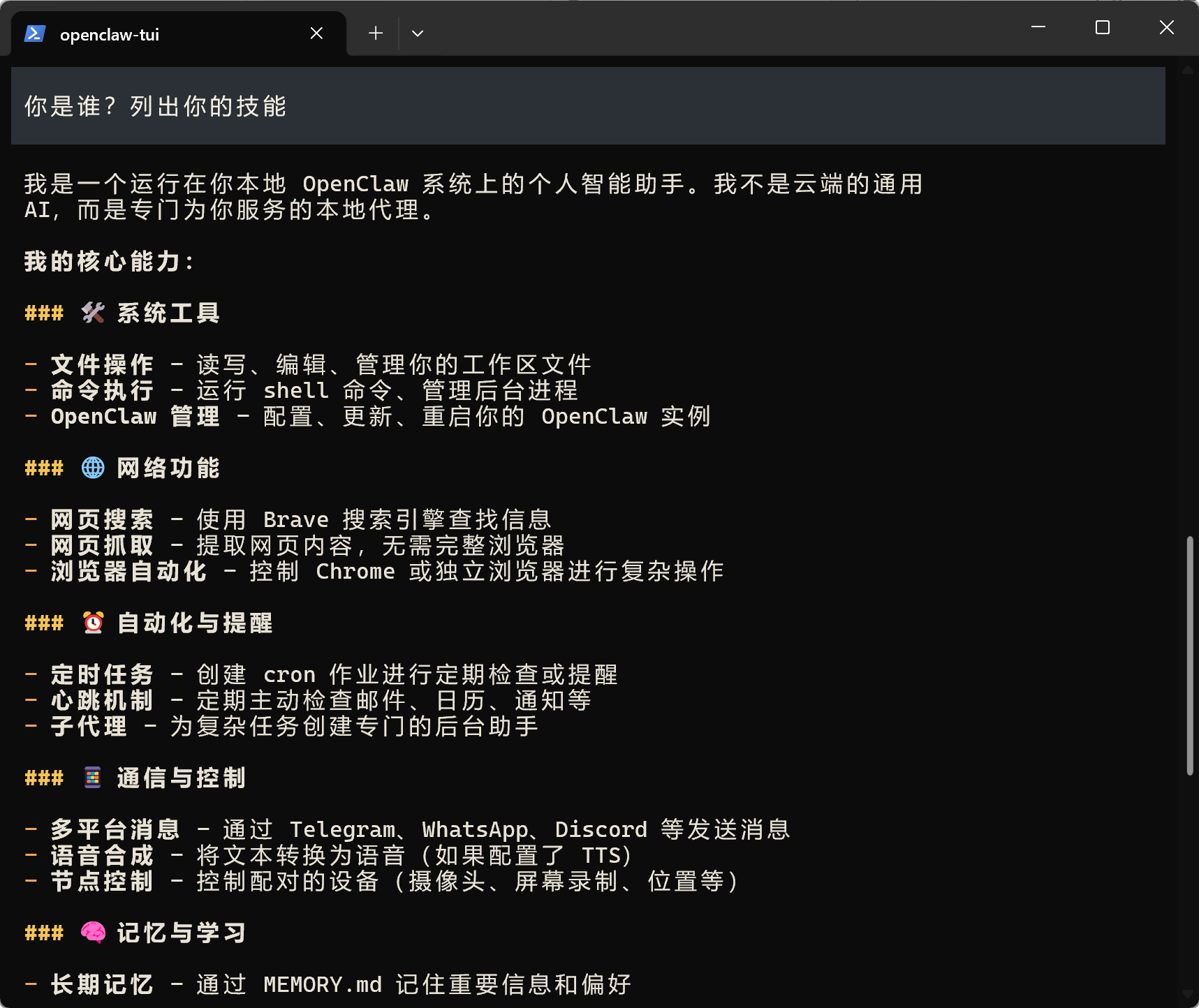 | 3. 技能系统(Skills) | 像手机安装App一样,可为助手动态安装新技能:整理文件、预订行程、管理日程、比价购物等![]() |