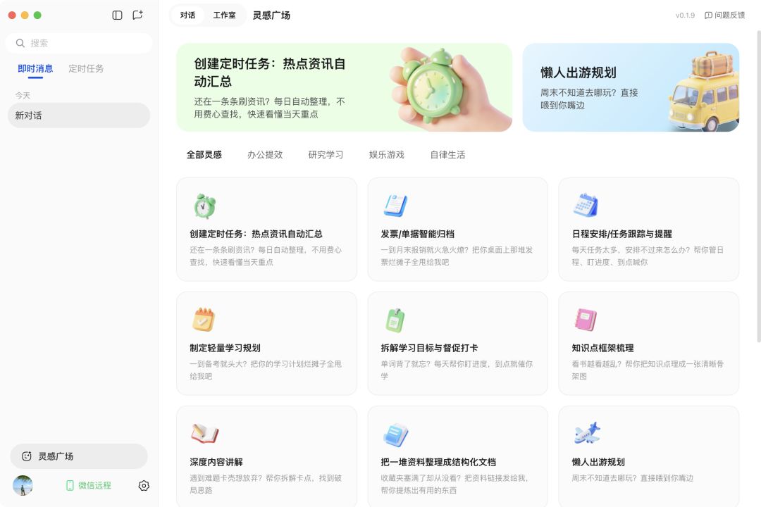 | 微信直联・远程协同 | 微信扫码绑定,手机发指令即可让电脑自动执行并反馈,随时随地远程办公 |
